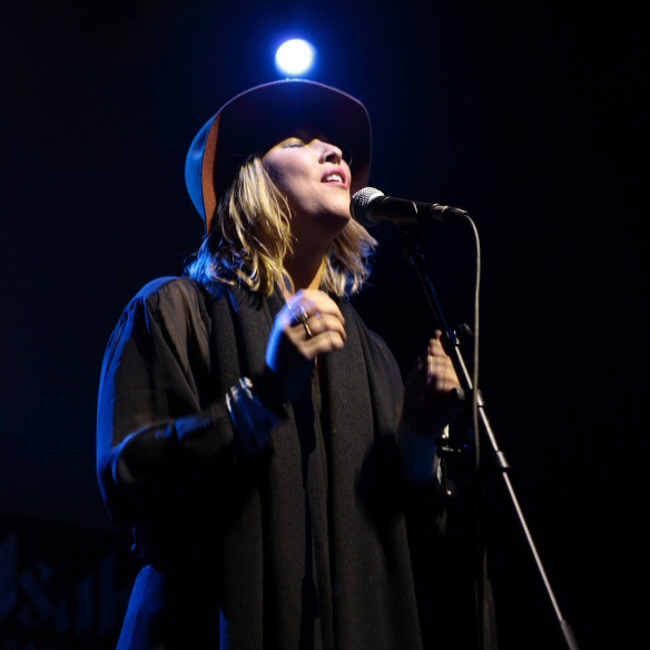 It takes a lot to persuade people to come out on a freezing January evening, so Juice pulled out a few stops for the first New Music Night of the year. Opening act Moya released her acoustic debut EP last year – I posted the video of her covering Primal Scream’s I’m Losing More Than I’ll Ever Have the other week. Apparently she’s in the studio at the moment, in a room next to Wiley, who’s interested in a collaboration of some sort! Vocally, Moya’s a less annoying Duffy – earnest singer songwriter stuff. She had another musician onstage, sitting behind a drum kit, but next to a keyboard, and who obviously fired off a lot of the backing tracks. Meanwhile Moya stood out front without even a guitar to hide behind, so she made do by wearing a big brimmed hat, making it near-impossible to see her eyes.